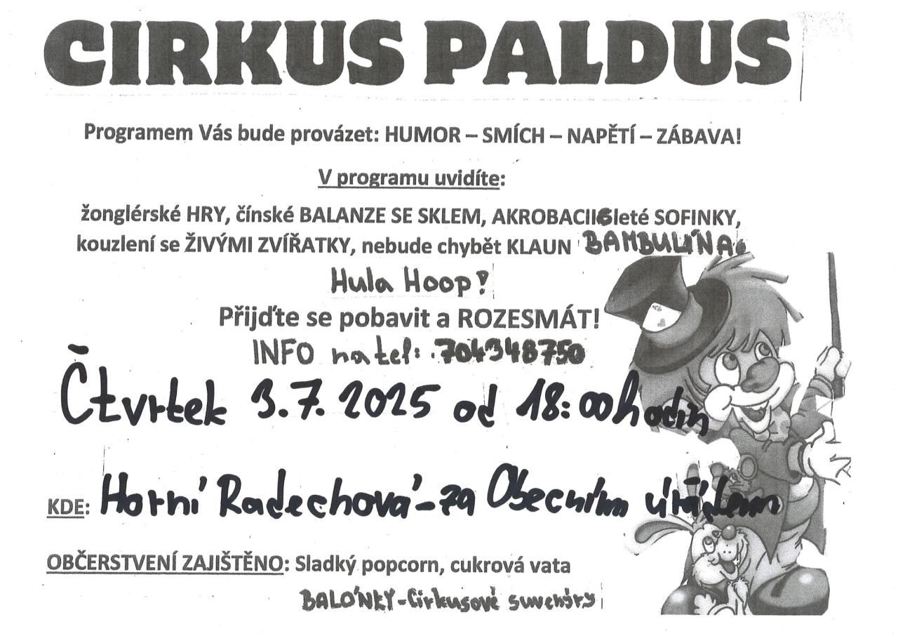 Ve čtvrtek 3.7.2025 bude u nás v obci malé vystoupení Cirkusu Paldus