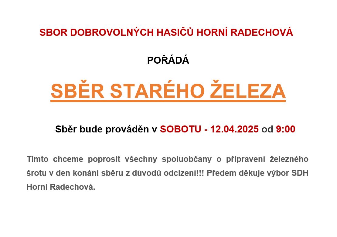 Sbor dobrovolných hasičů Horní Radechová pořádá sběr starého železa, který se uskuteční v sobotu 12. dubna 2025 od 9:00. Žádáme občany, aby připravili železný šrot v den akce, aby se předešlo odcizení. Děkujeme za vaši spolupráci.